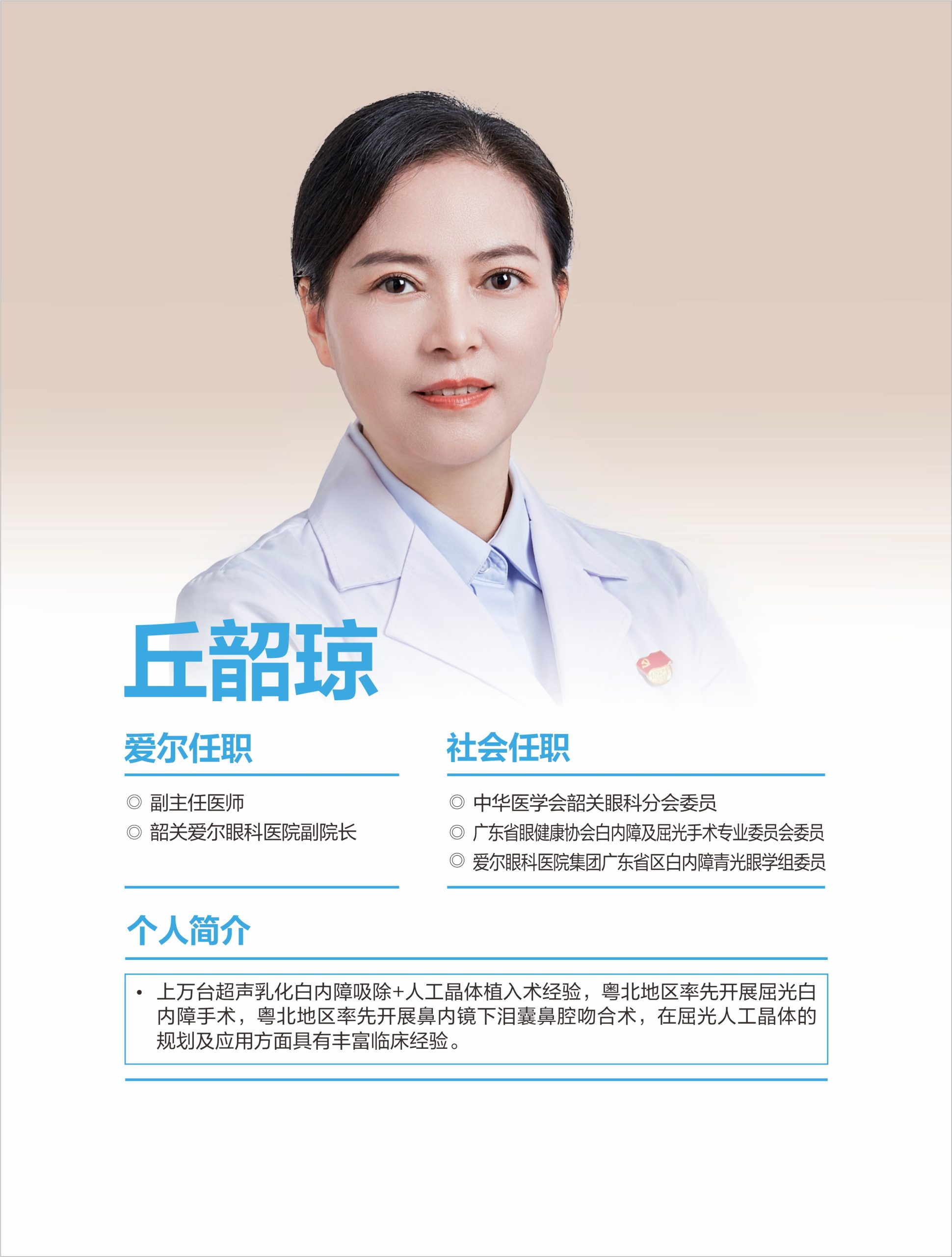 韶關(guān)愛爾眼科醫(yī)院有限公司白內(nèi)障團(tuán)隊擁王愛琴院長(愛爾眼科粵北區(qū))、丘韶瓊院長、郭俊豪主任等多位??漆t(yī)生,具備同步國際的白內(nèi)障手術(shù)能力,能熟練開展各項常規(guī)及疑難白內(nèi)障手術(shù)。 可開展微切口煥晶白內(nèi)障手術(shù),植入多焦晶體或多焦+散光矯正晶體,在治療白內(nèi)障同時同步解決遠(yuǎn)視/近視、老花眼、角膜散光等屈光問題,醫(yī)生手術(shù)經(jīng)驗豐富,為眾多患者帶來更舒適的視覺。